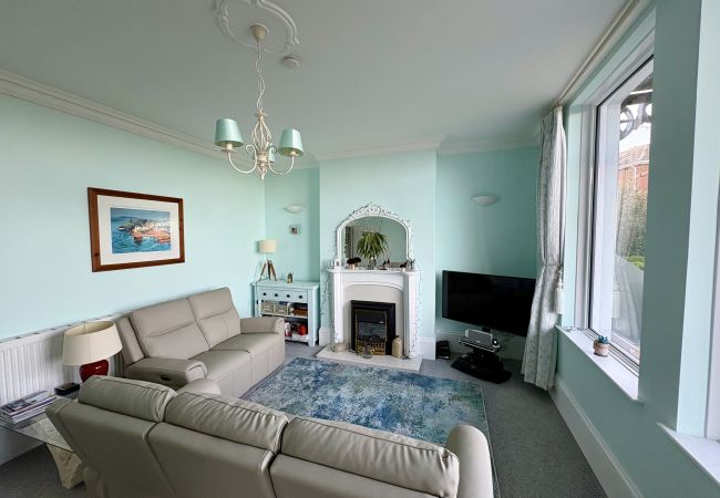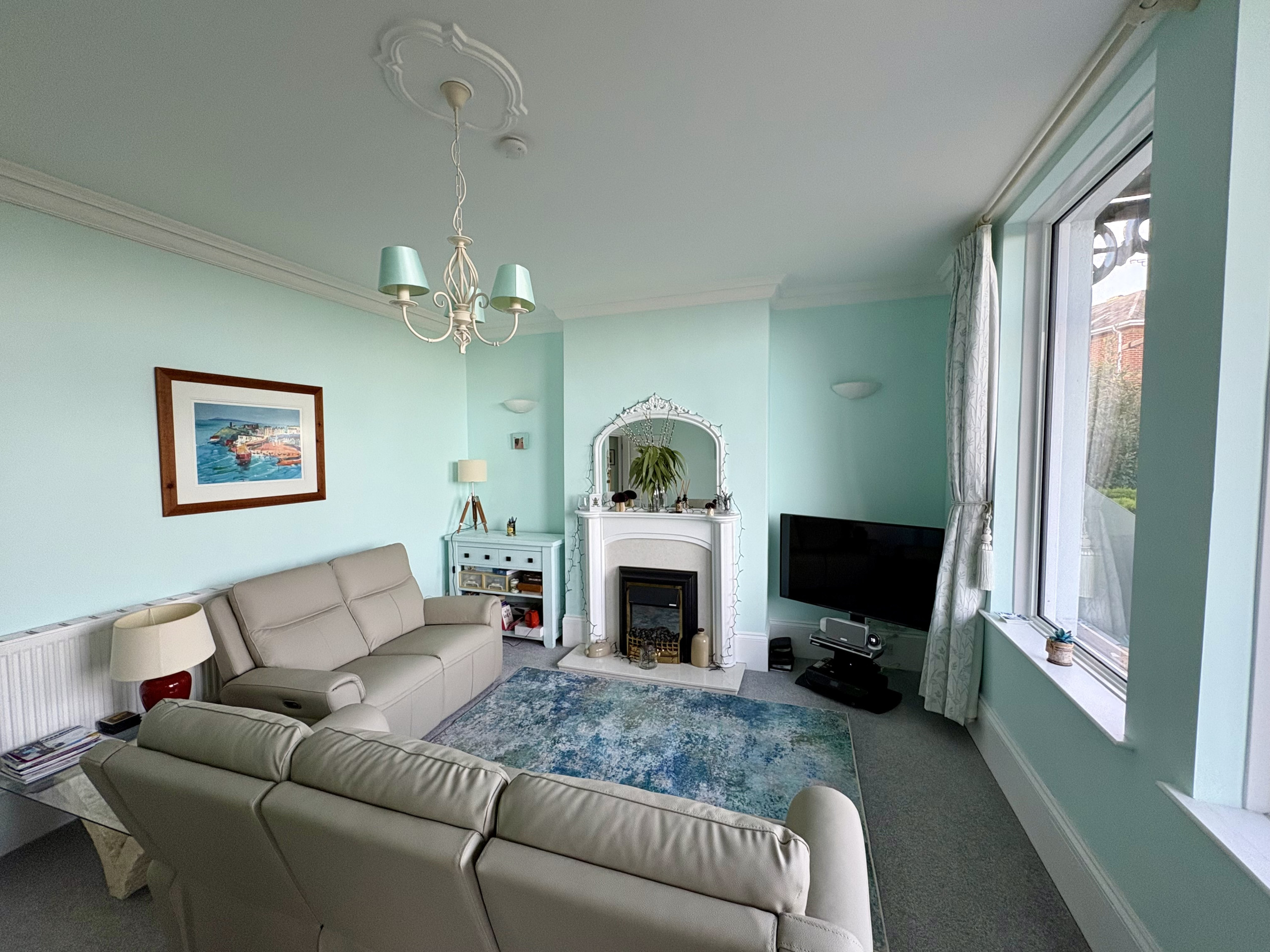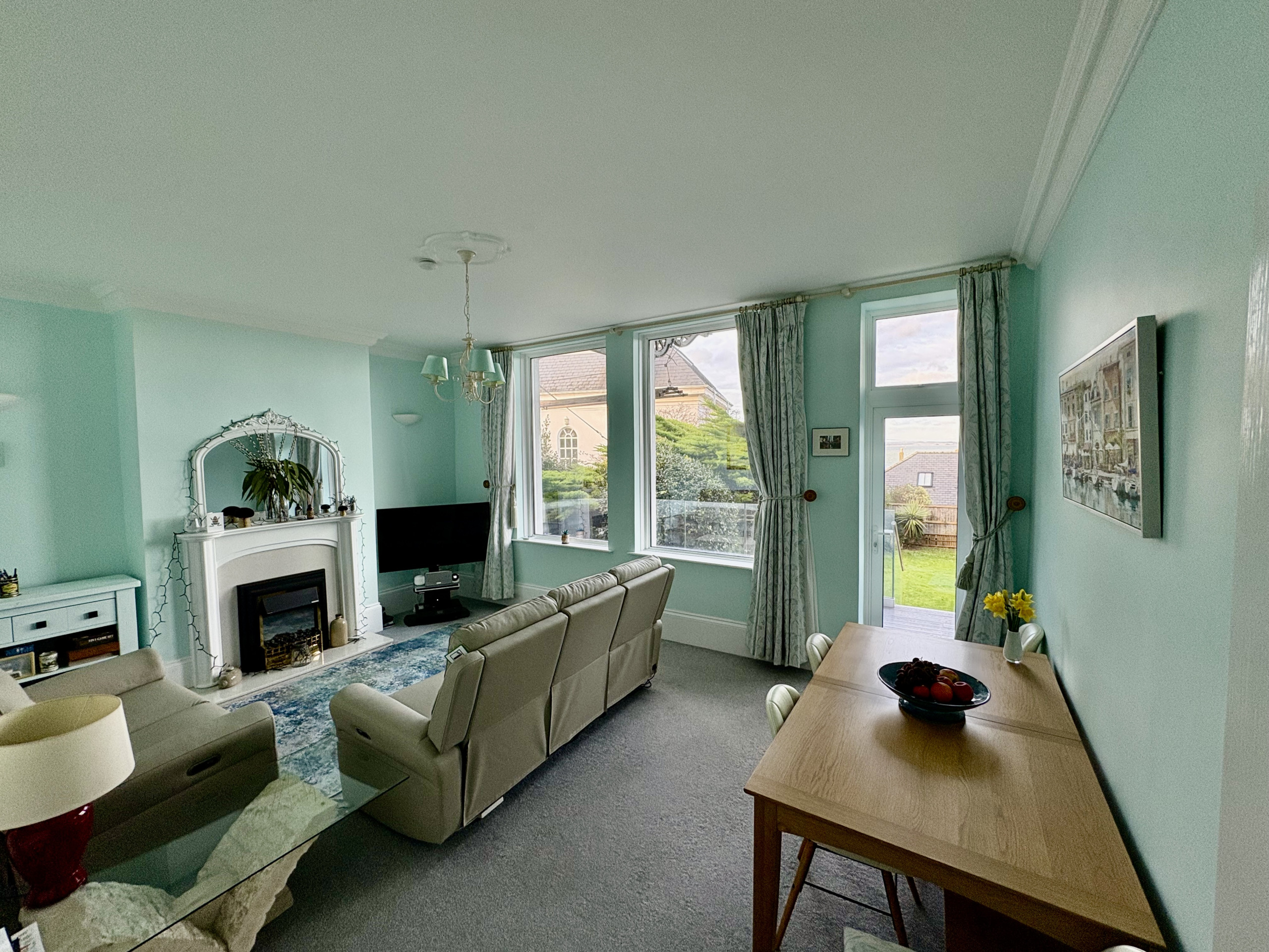 Living Room - A bright and welcoming reception room with two large tilt-and-open windows showcasing beautiful views across the Solent. Direct access leads onto the veranda and garden, creating a seamless connection to the outdoors.