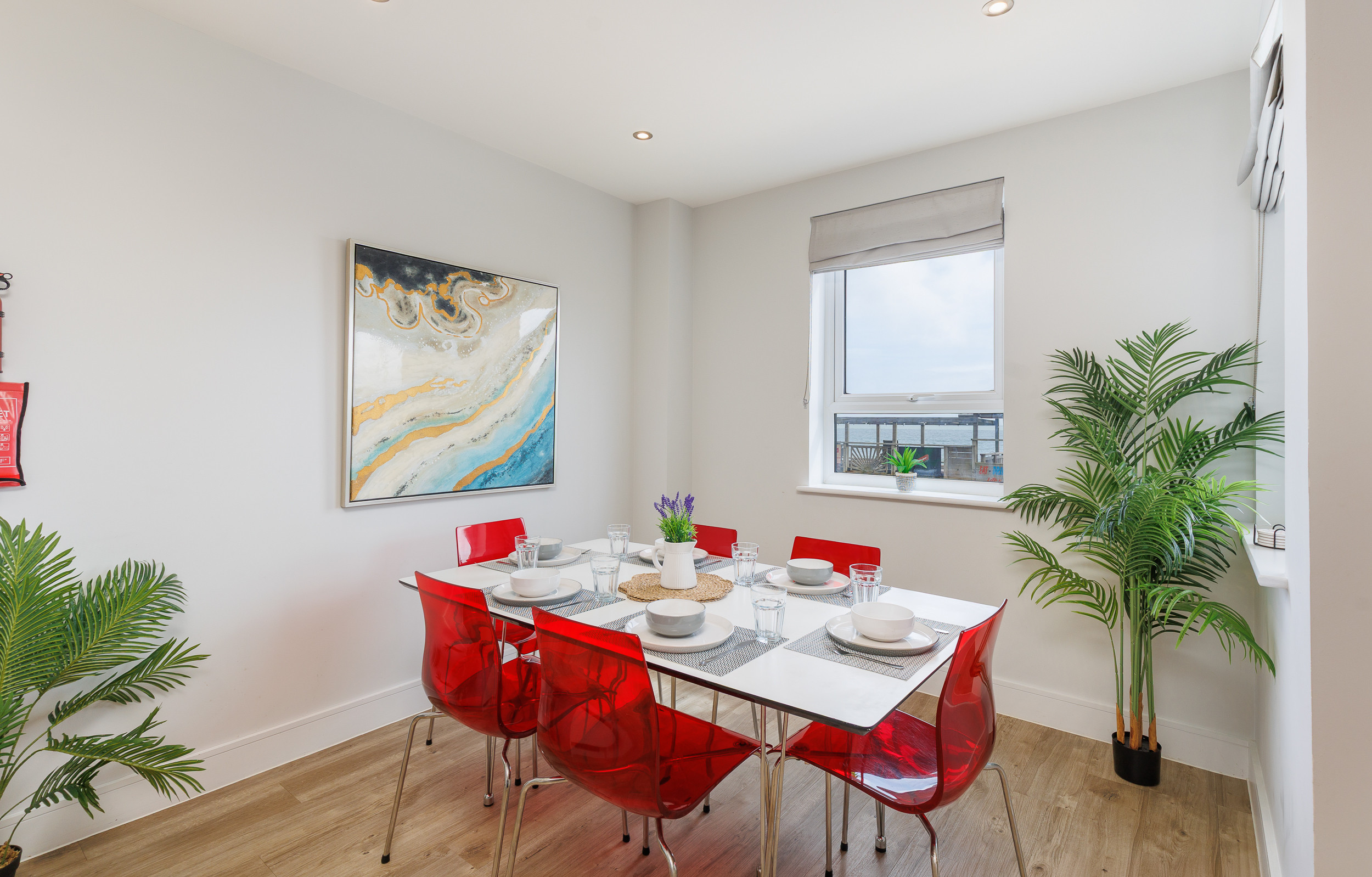 Comfortable seating, large Smart TV with streaming services (Netflix & Amazon Prime), dining table with seating for up to 6 guests, large windows with sea views