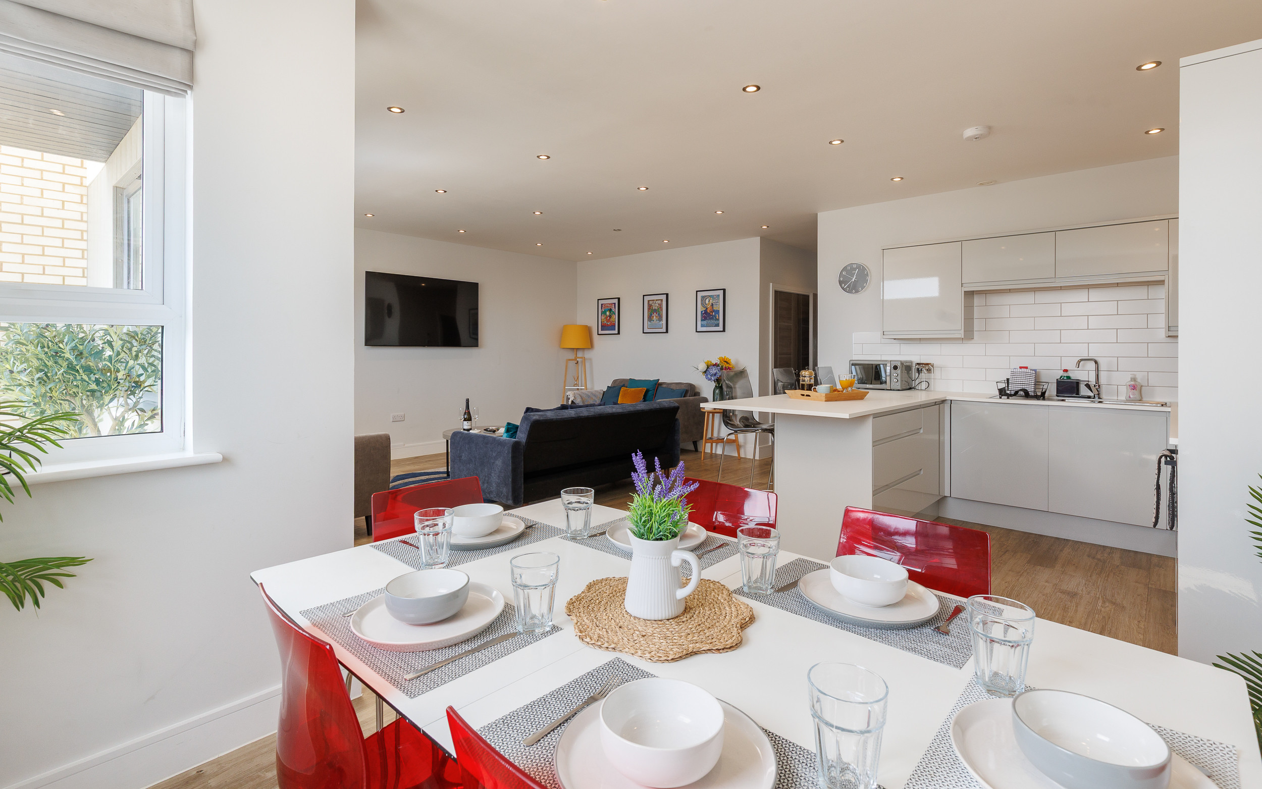 Open plan kitchen diner/ lounge: integral double oven, induction hob, microwave, washing machine, dishwasher, fridge, freezer, ground coffee machine, breakfast bar, sofa and 1x double sofa bed (If you would like us to supply linen for its use during your stay, this can be provided at an additional cost of £35, per stay), side table, ottoman, dining table and chairs