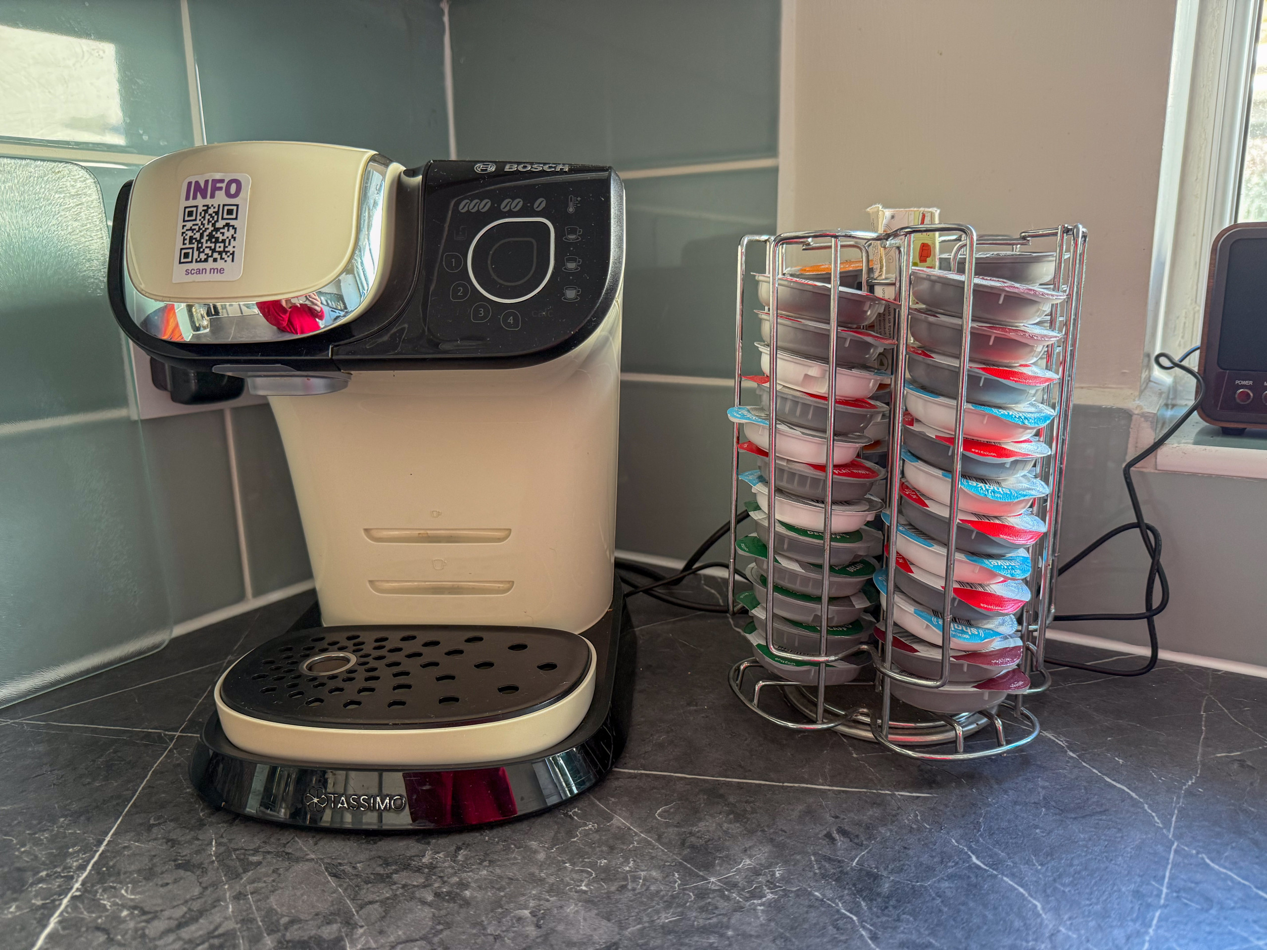 Kitchen: electric cooker, microwave, fridge/freezer, coffee machine, dishwasher, washing machine, kettle, toaster, iron and board, along with breakfast table and chairs