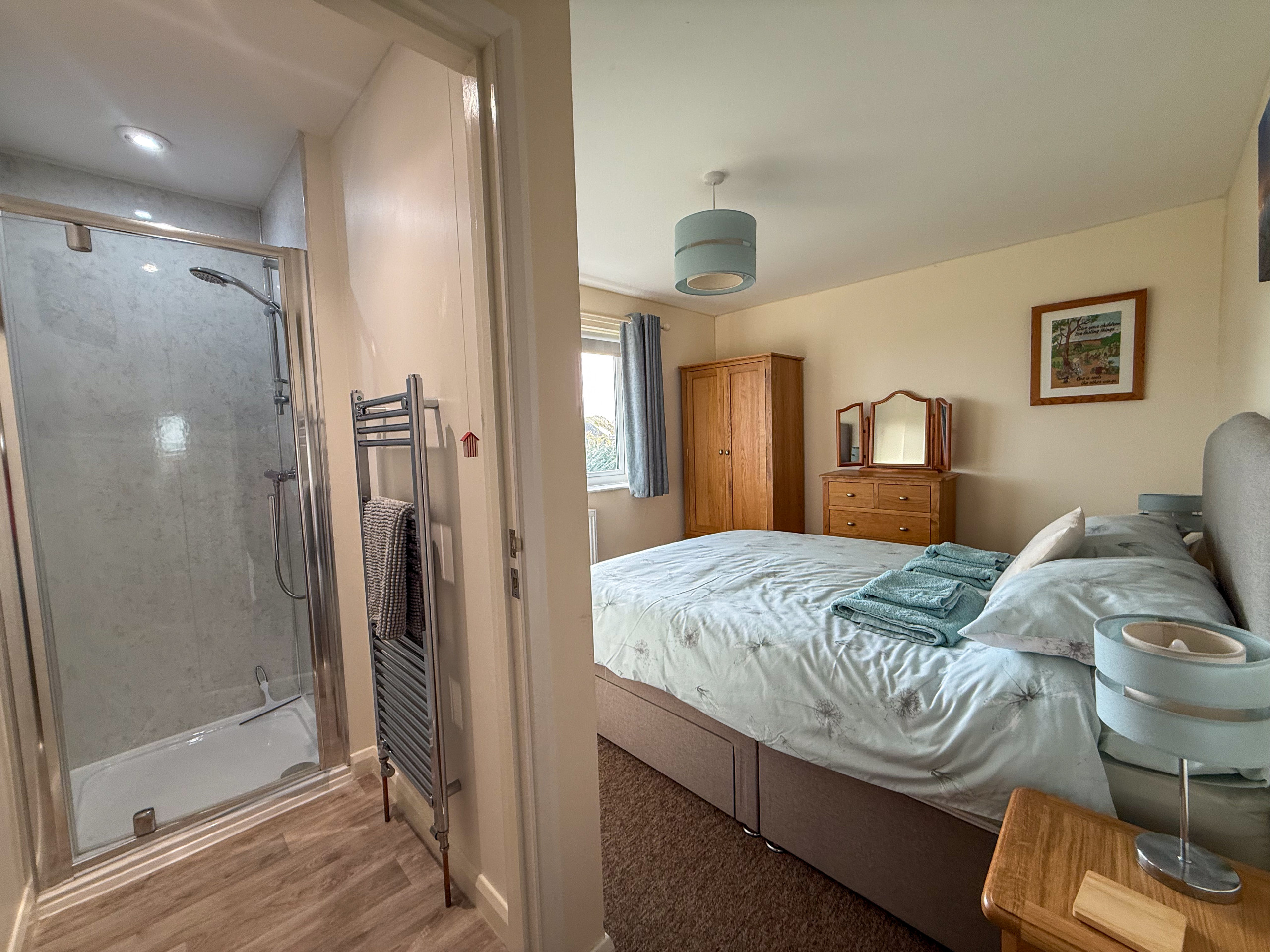 Bedroom 1: King size bed, wardrobe and chest of drawers and a walk in shower.