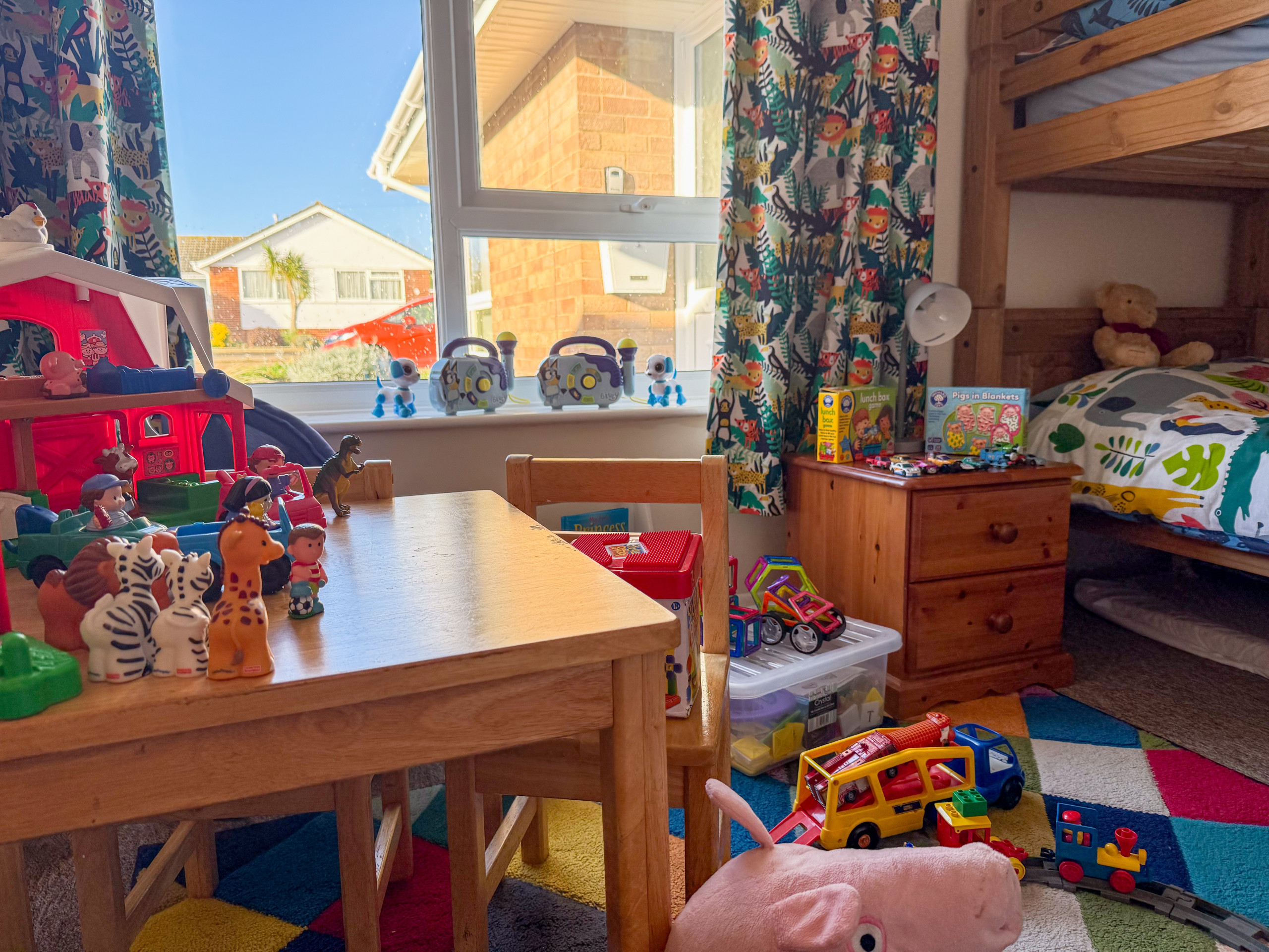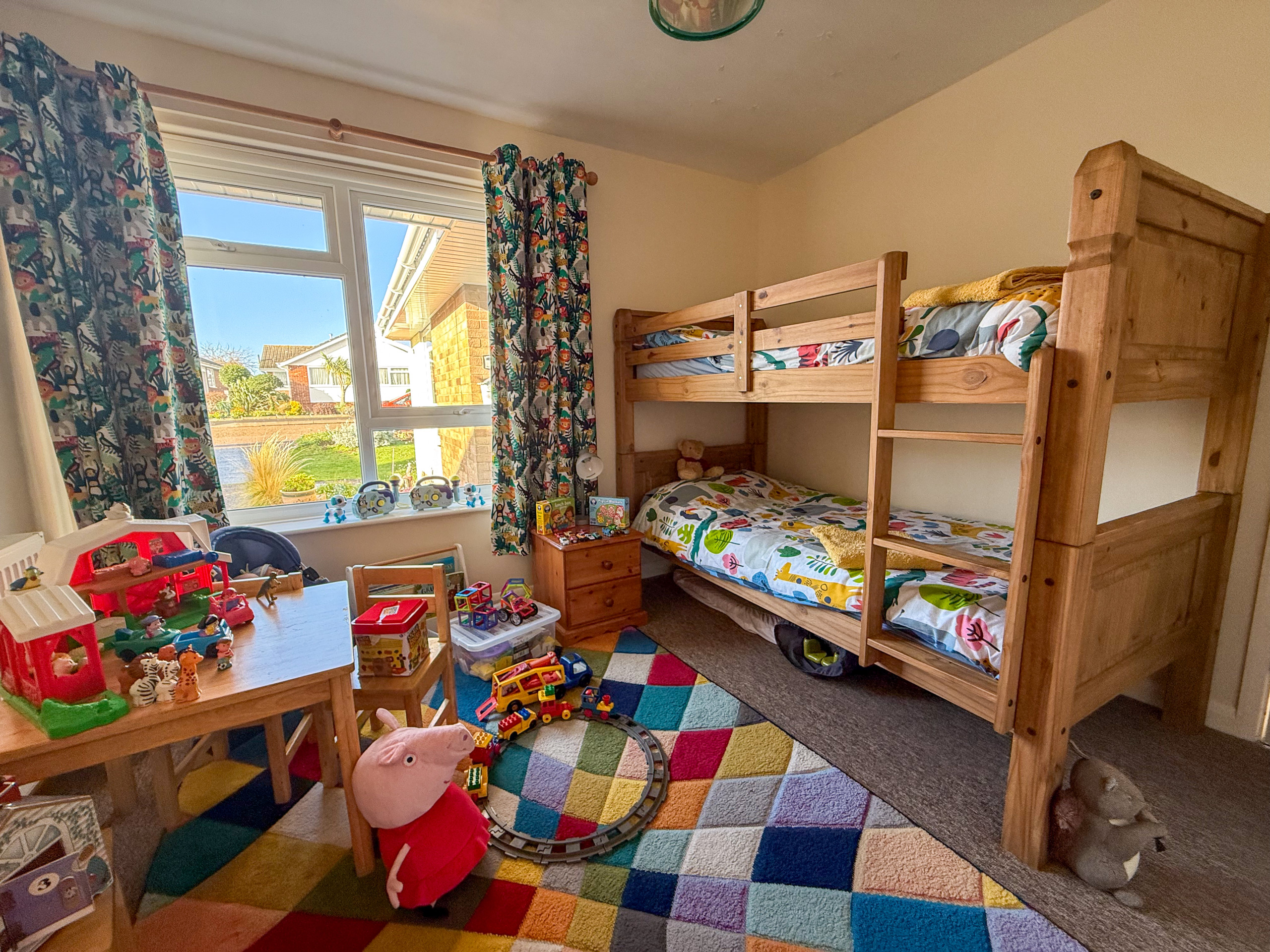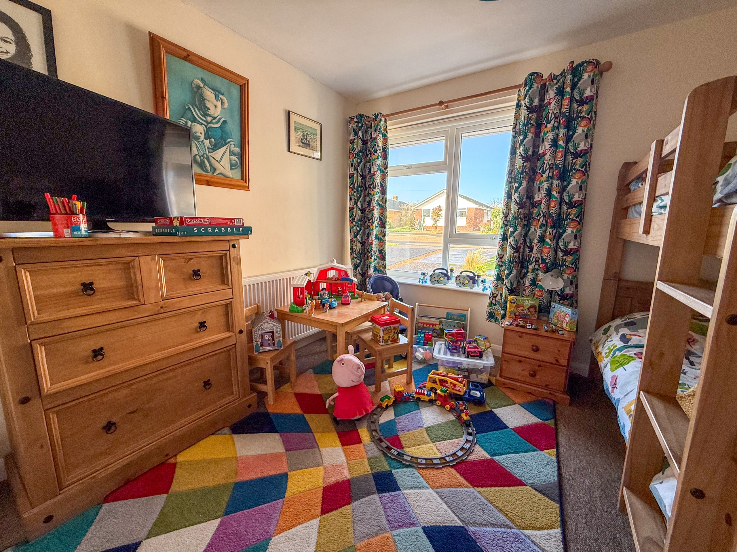 Bedroom 2: Bunk beds, chest of drawers, children's table and chairs, Freeview TV