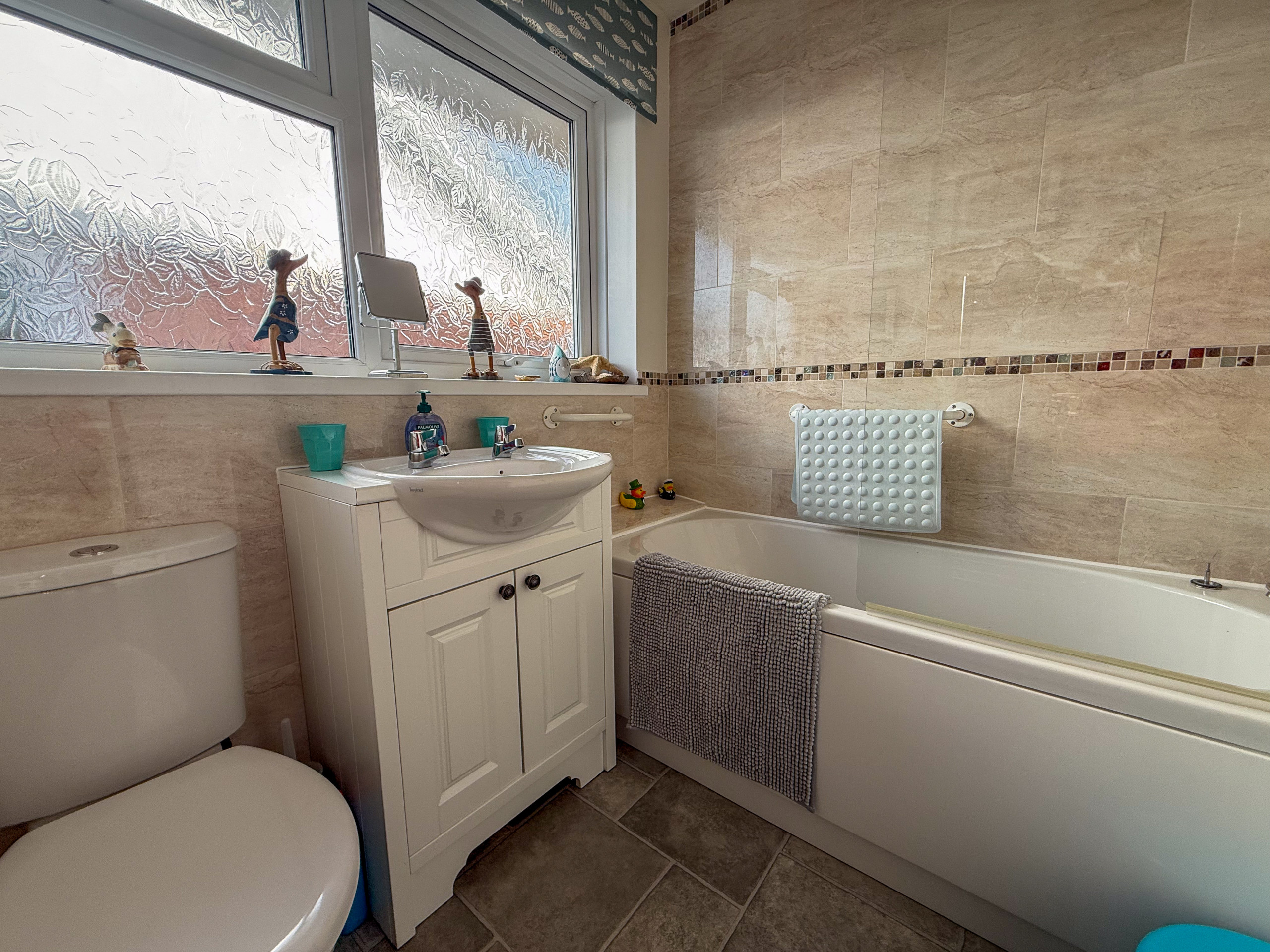 Bathroom: Bath with overhead shower, wash basin, toilet and heated towel rail