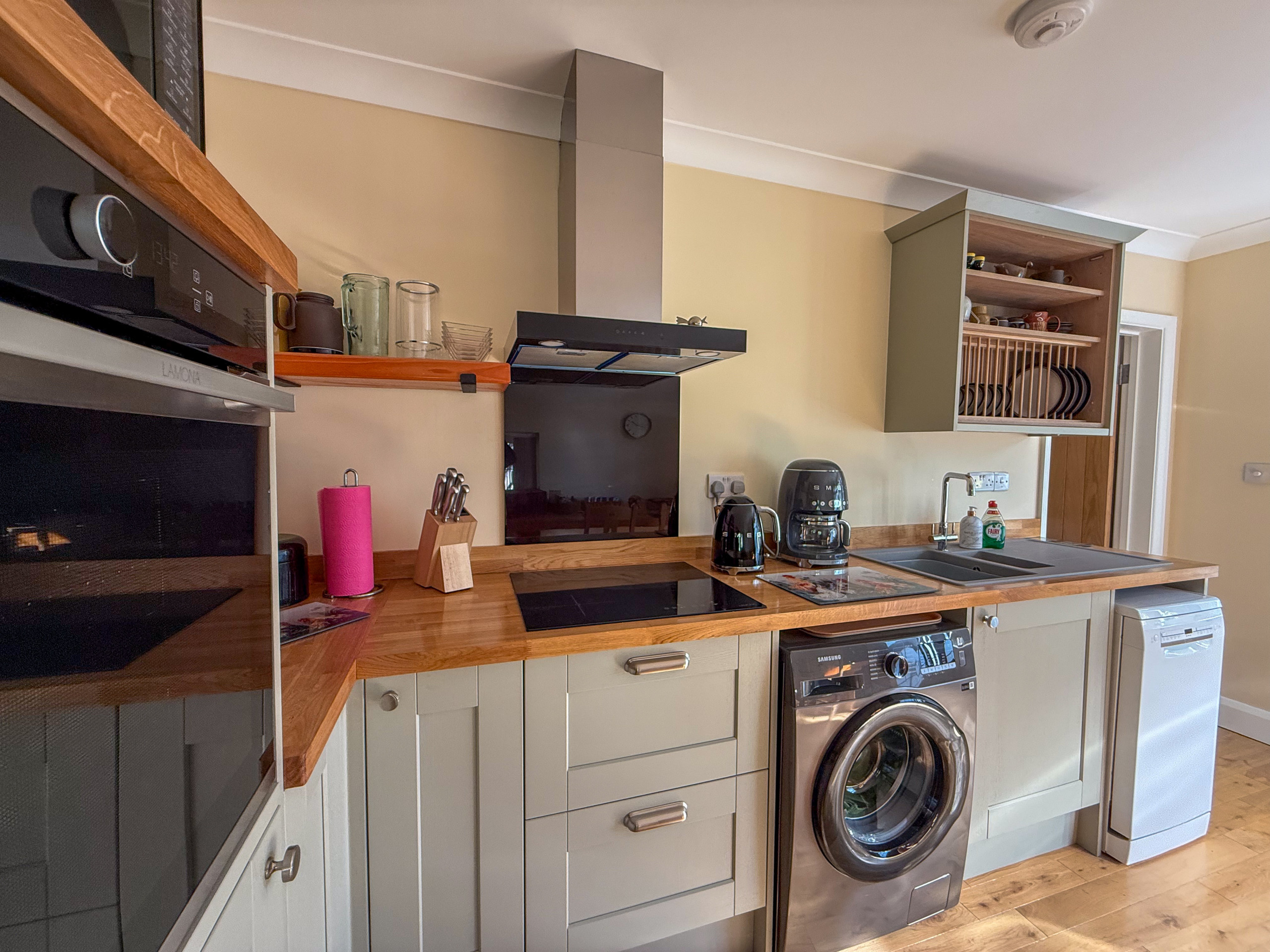 Kitchen - breakfast bar, electric oven and hob, microwave, Smeg kettle, toaster, coffee machine, washing machine and dishwasher.