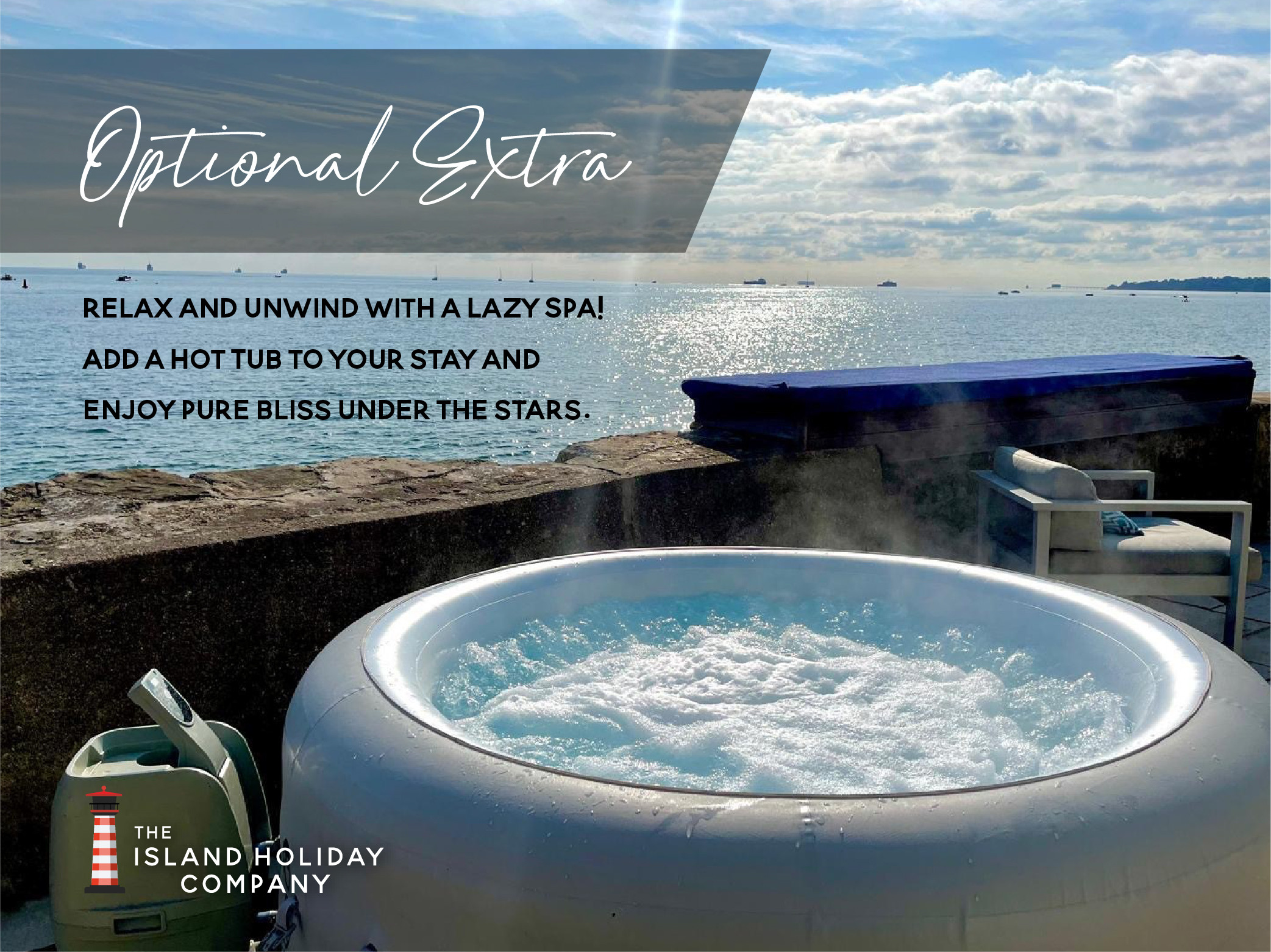 Relax, unwind, and soak under the stars with your very own Lazy Spa hot tub, available as an optional upgrade for your stay.