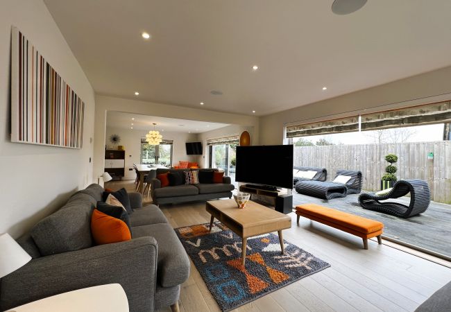 Living Area: 50” Smart TV, Sonos sound system, oak flooring, bi-folding doors to decked seating and garden