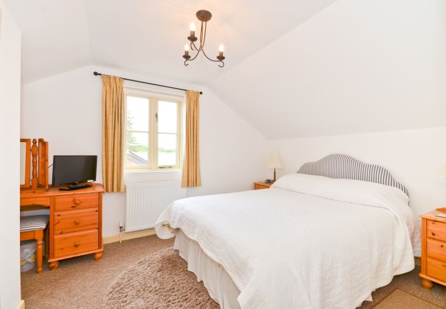 The comfortable double bedroom has bedside units, tv, chest of drawers and a dressing table.