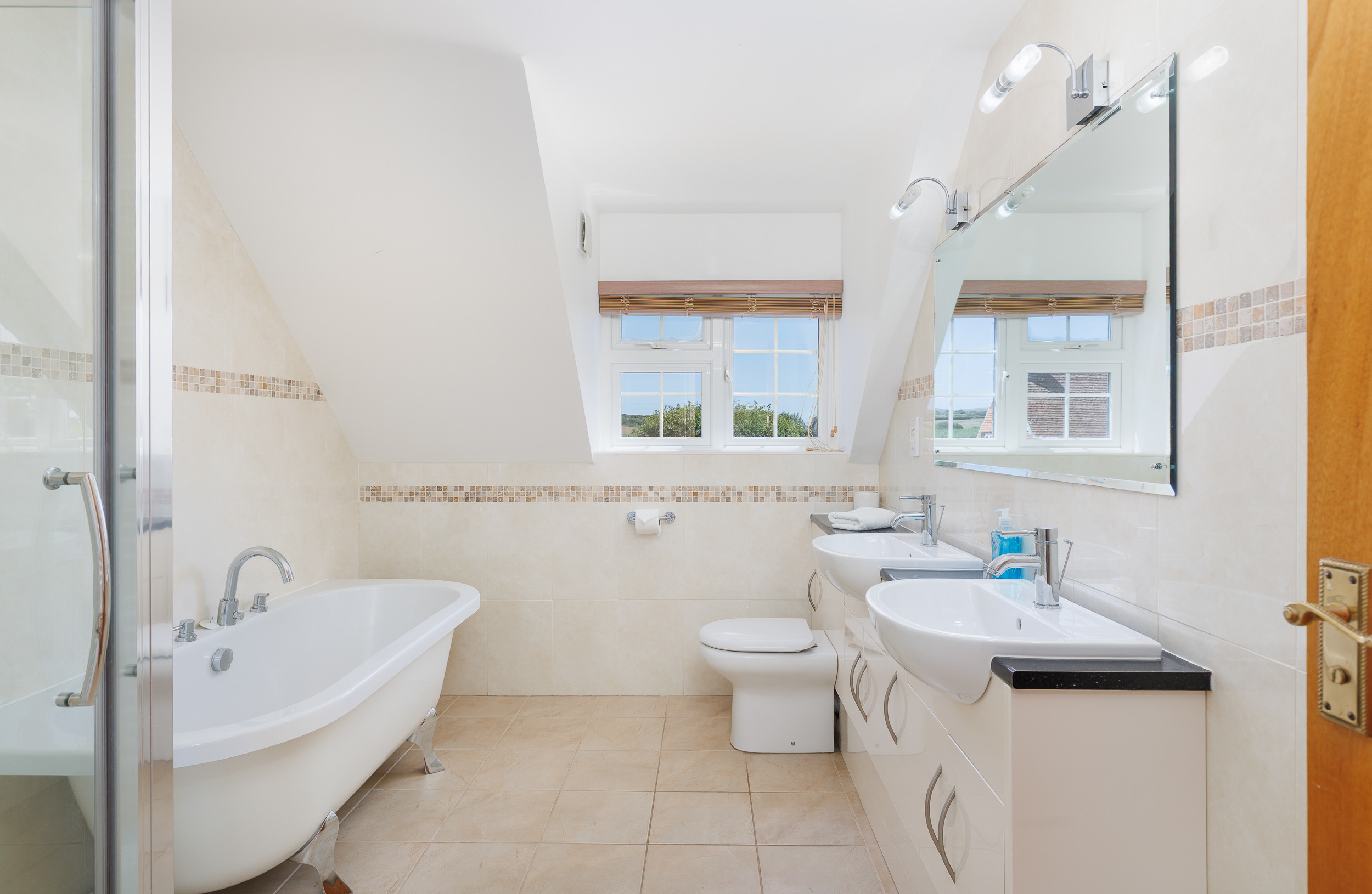 En-suite: freestanding bath, shower cubicle, toilet and twin wash basins