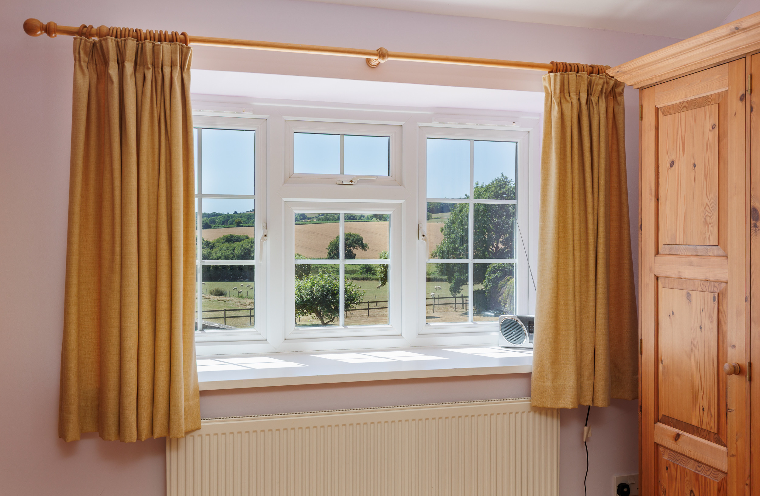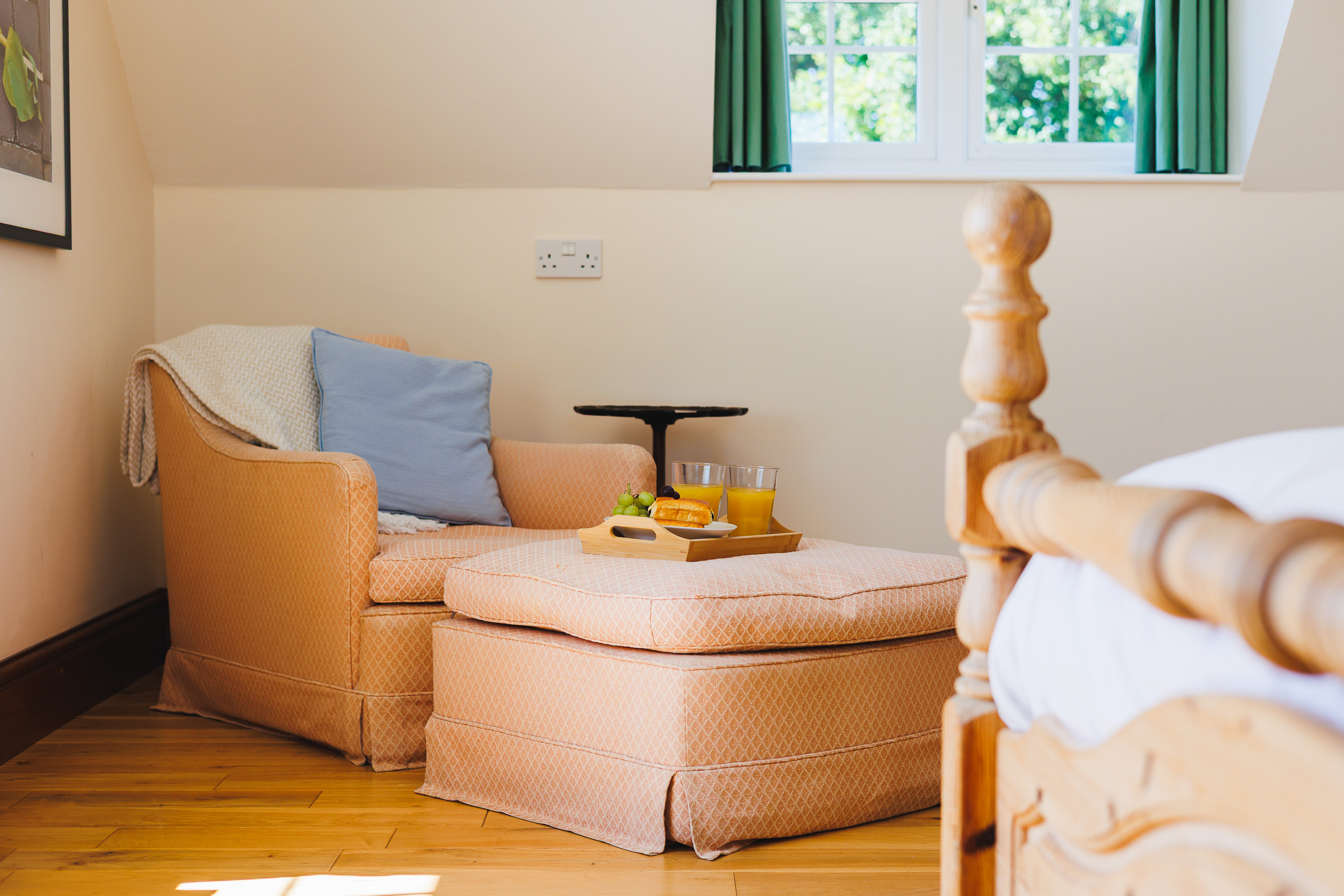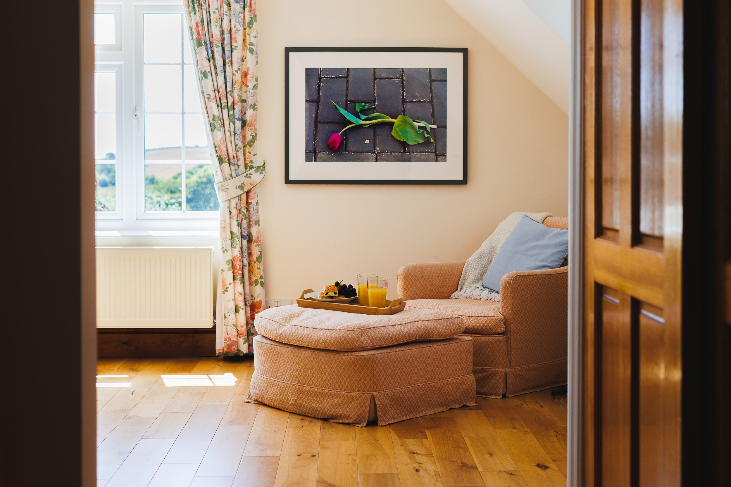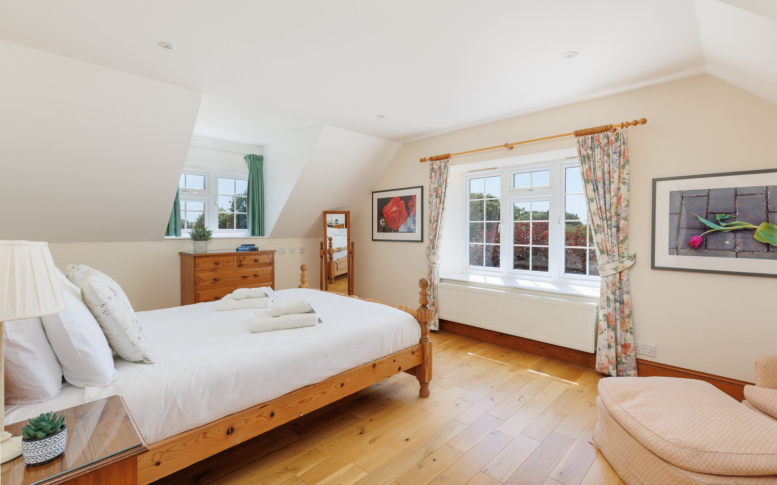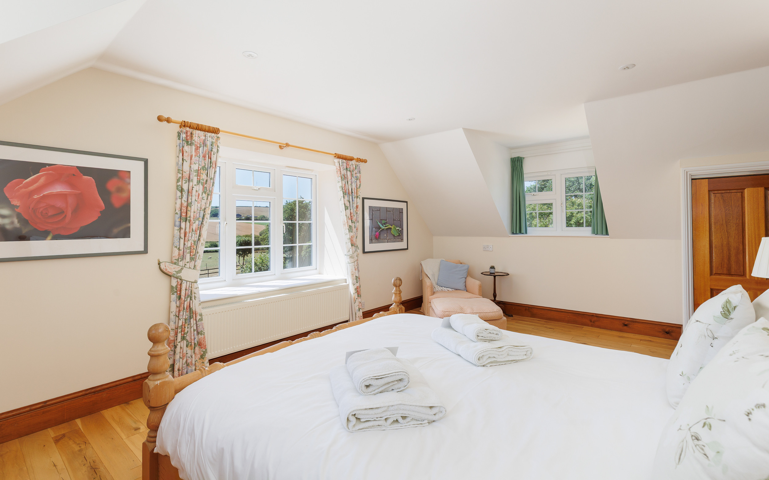 Bedroom 1: master bedroom with king size bed, built in wardrobes, chest of drawers, bedside cabinets, wooden cot, chair, countryside views from the triple aspect windows and en-suite