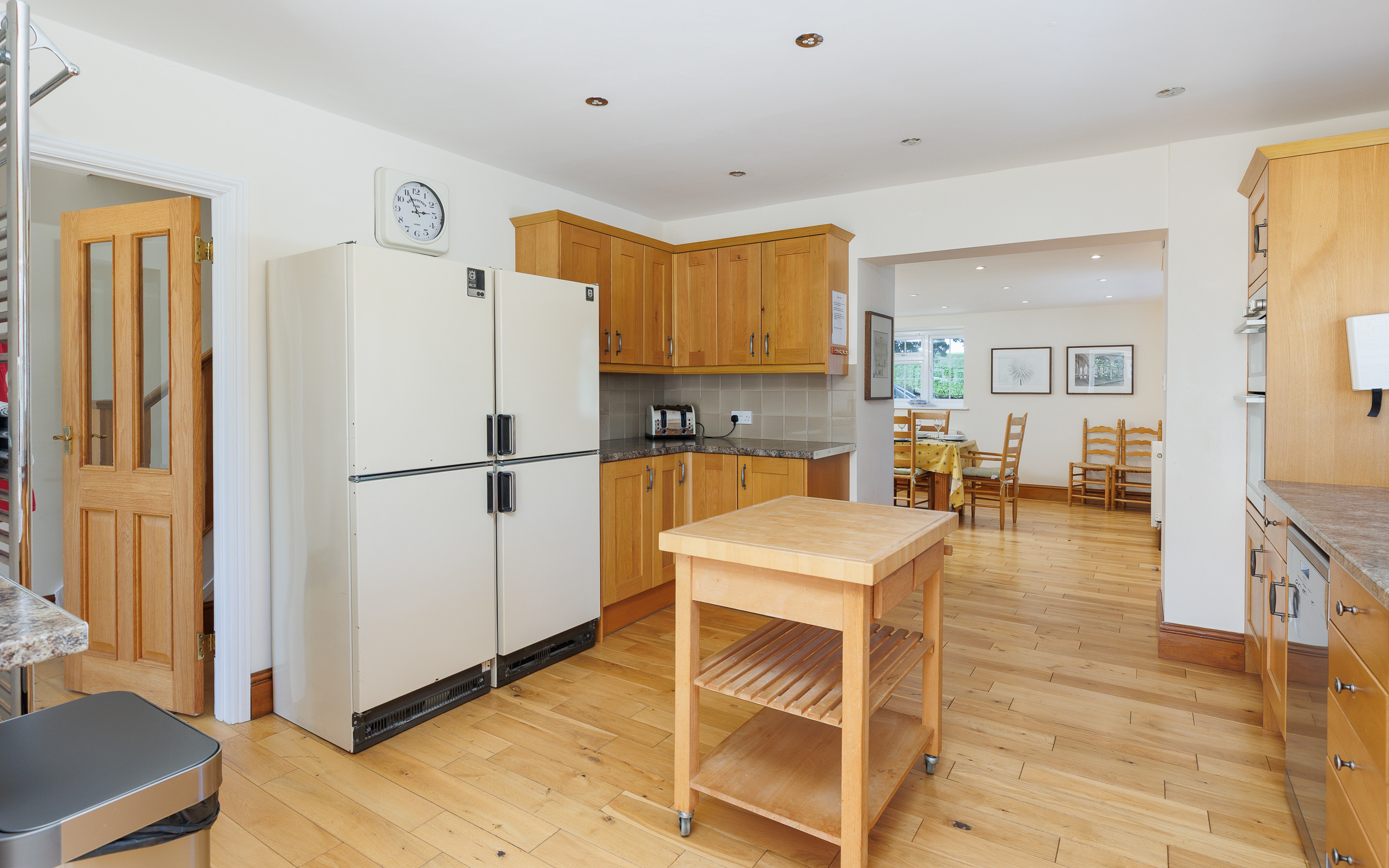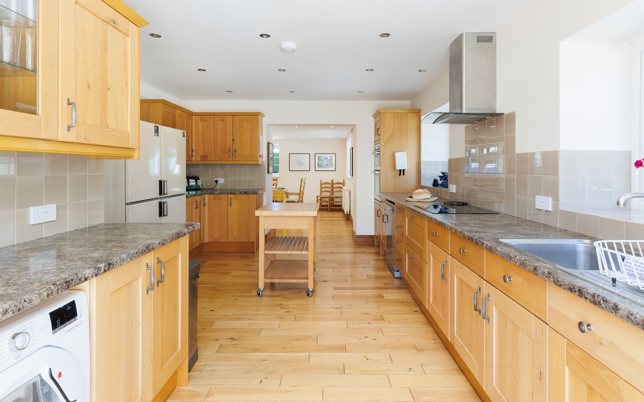 Kitchen: electric hob, oven and grill, microwave, fridge/ freezer, kettle, toaster, dishwasher, washing machine, tumble dryer, butchers block, with doors leading to the patio and pool area