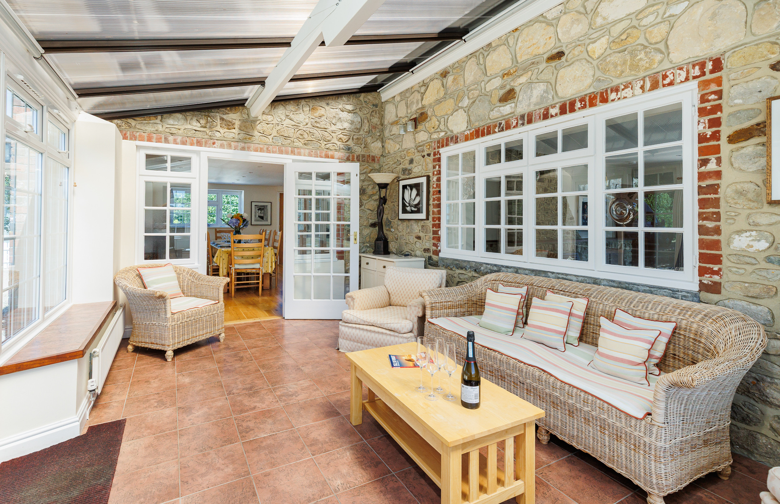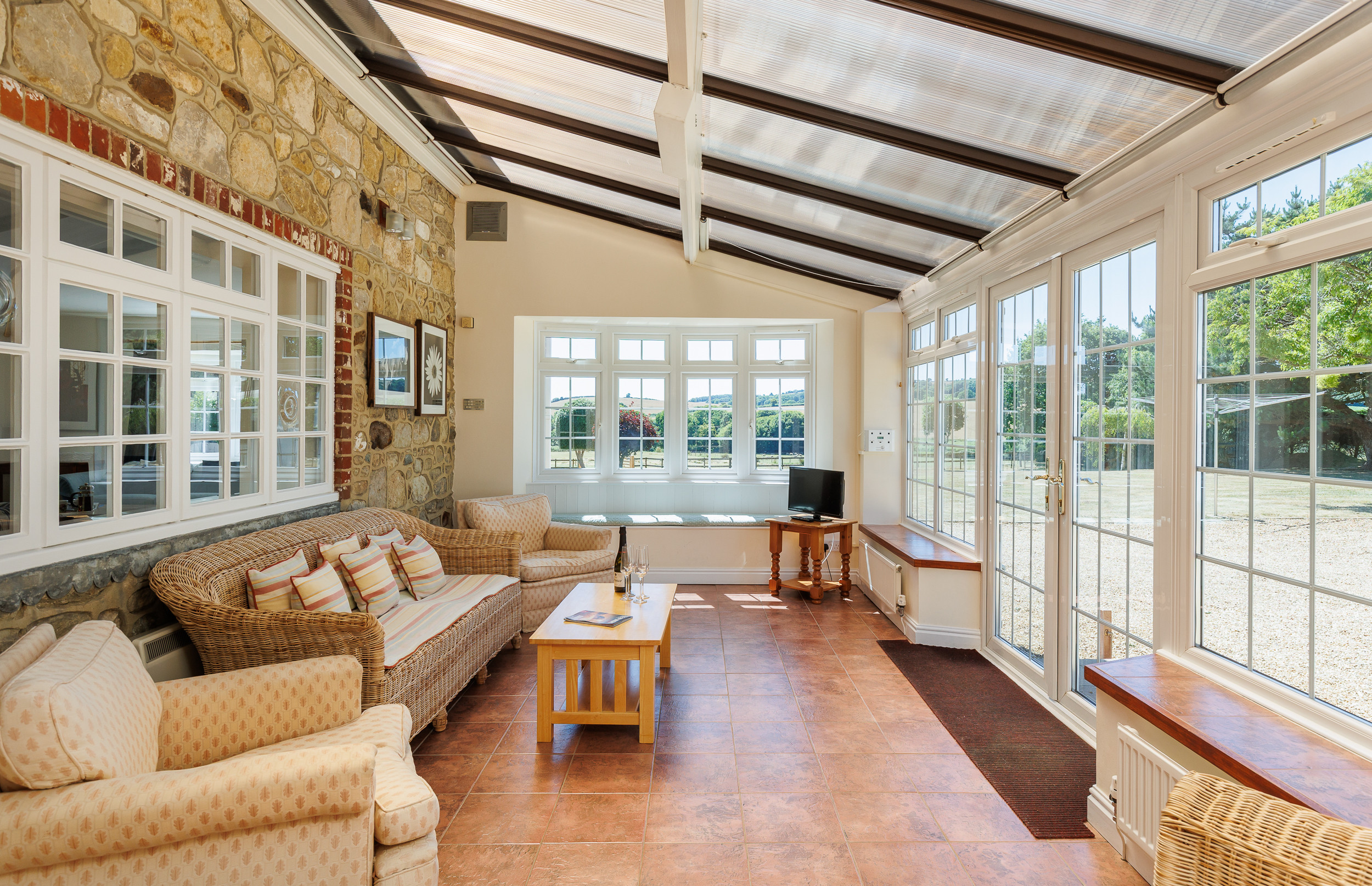 Conservatory: wicker seating and armchairs, coffee table, TV and doors leading to garden